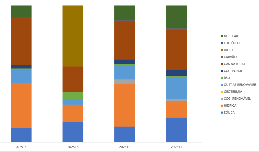 A figura abaixo representa o mix de energia comercializada pela Gas Natural Comercializadora, S.A. com valores trimestrais, e a sua repartição por tecnologia utilizada.